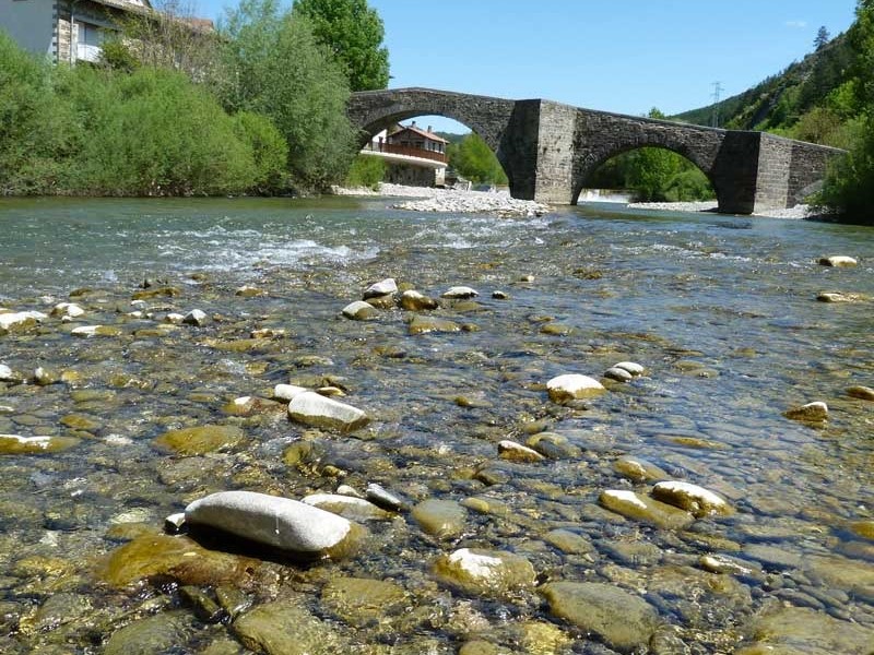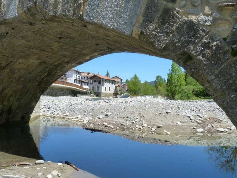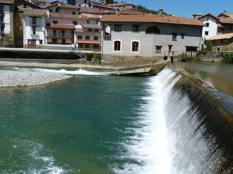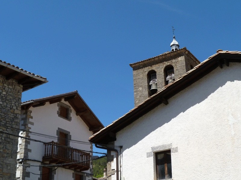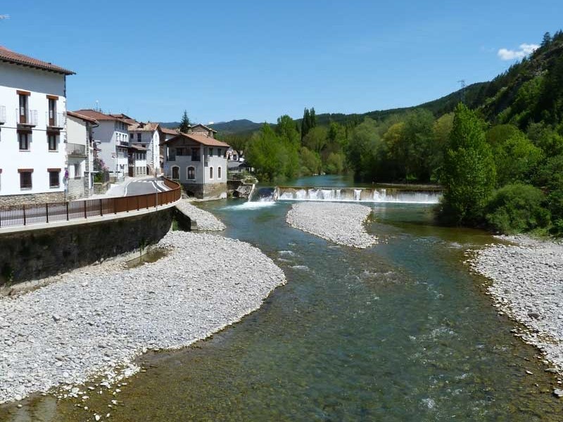 El puente romano nos recibe a la entrada del pueblo con su inconfundible estructura de postal. Todavía conserva sus cuatro arcos originales, su viejo peralte y sus tajamares para rasgar las aguas del río Esca. A escasos metros aguas arriba, una pequeña presa o «puerto» por donde descendían las almadías nos recuerda que el aprovechamiento maderero, junto con la ganadería, ha constituido la principal dedicación de sus habitantes.