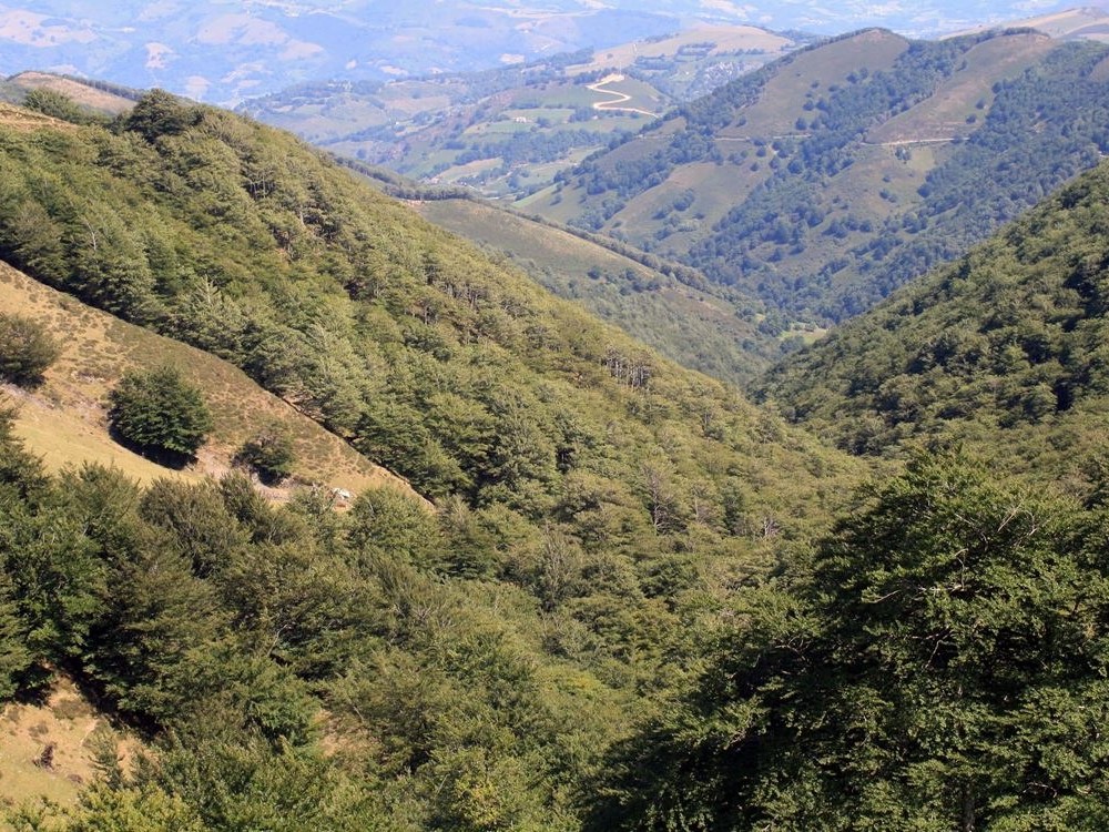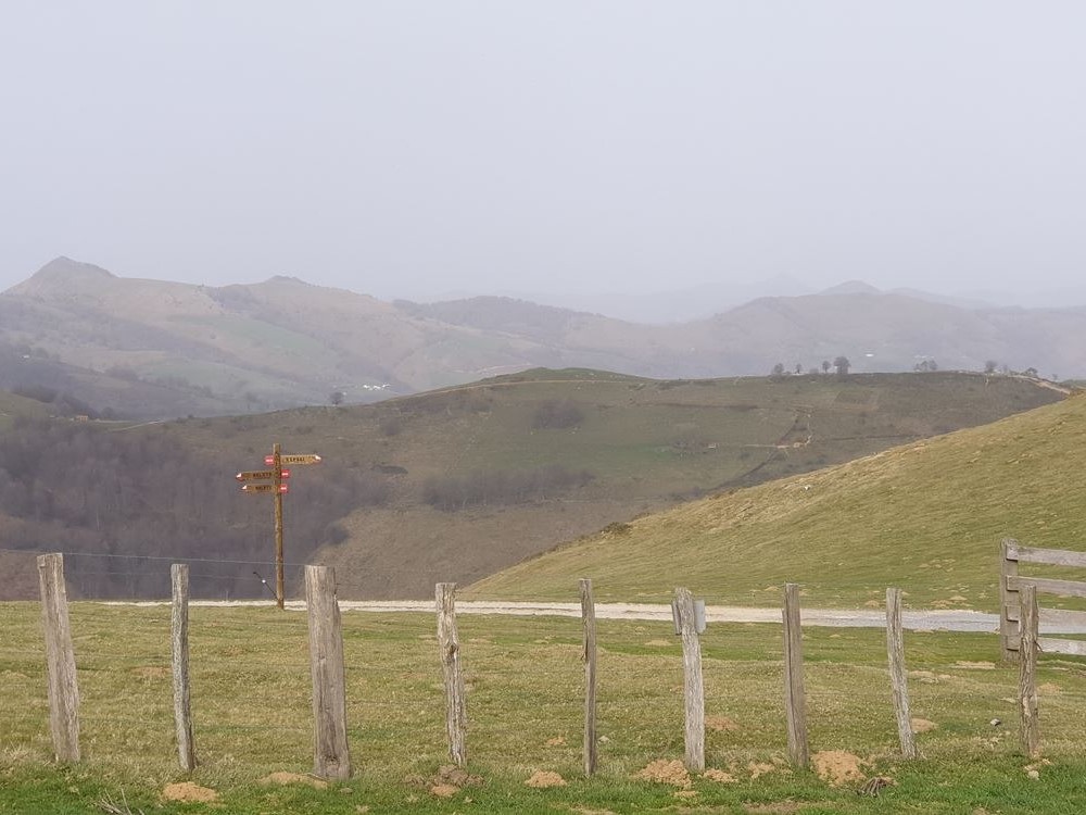 El descenso lo hacemos paralelo a una alambrada, debemos tener precaución porque el suelo puede estar un poco resbaloso y la pendiente es muy pronunciada. Siguiendo las marcas llegamos a un giro a la derecha para tomar el GR-11 identificado con marcas blancas y rojas, este nos lleva de vuelta a Sorogaín.