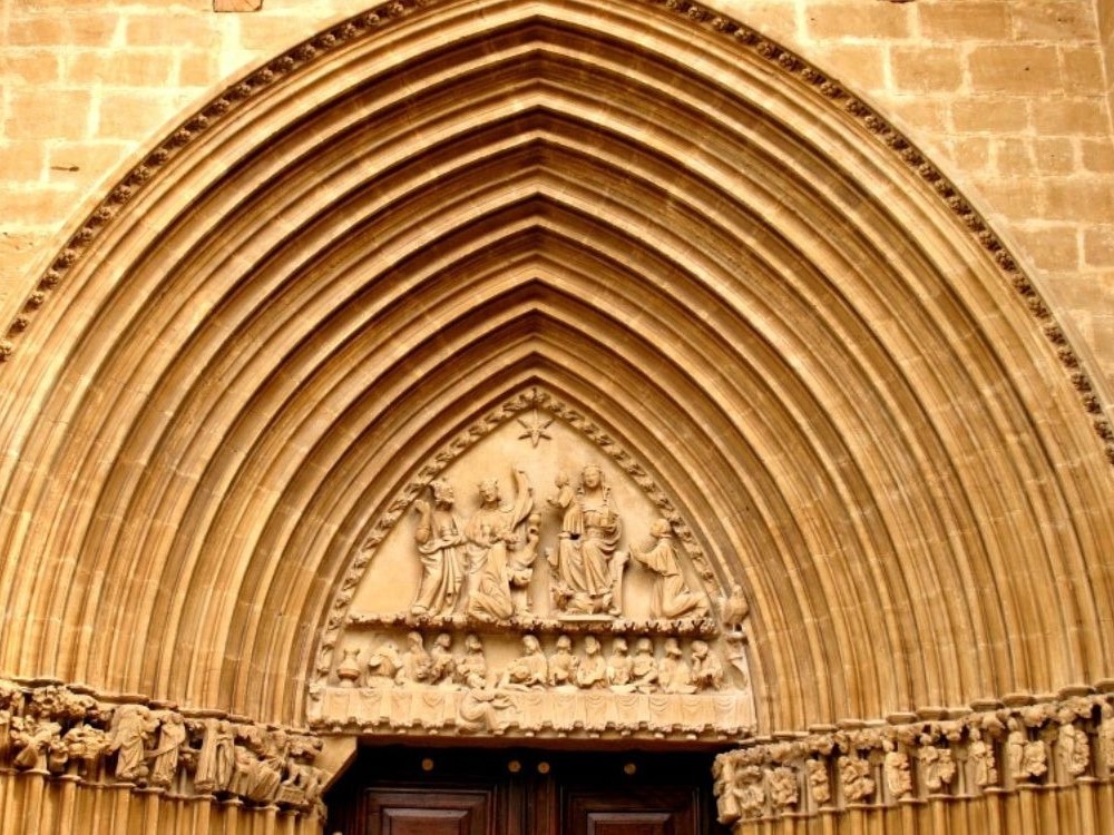 Presenta un esquema apuntado y abocinado de diez arquivoltas todo ello ricamente ornamentado. Destaca el tímpano central en el que vemos representadas la Última Cena y la Adoración de los Reyes Magos, ambas escenas de gran dinamismo.